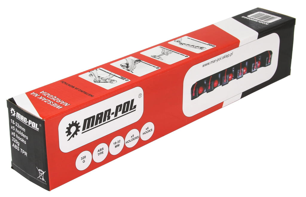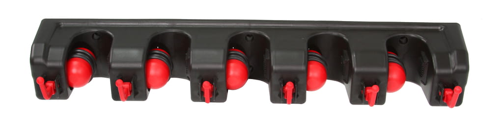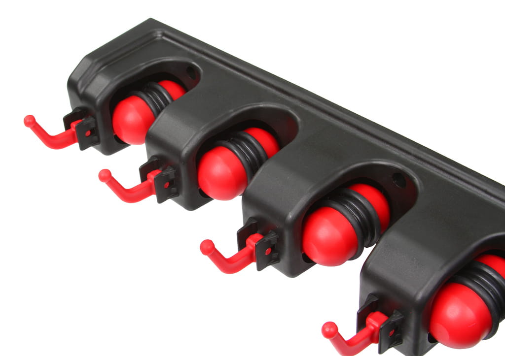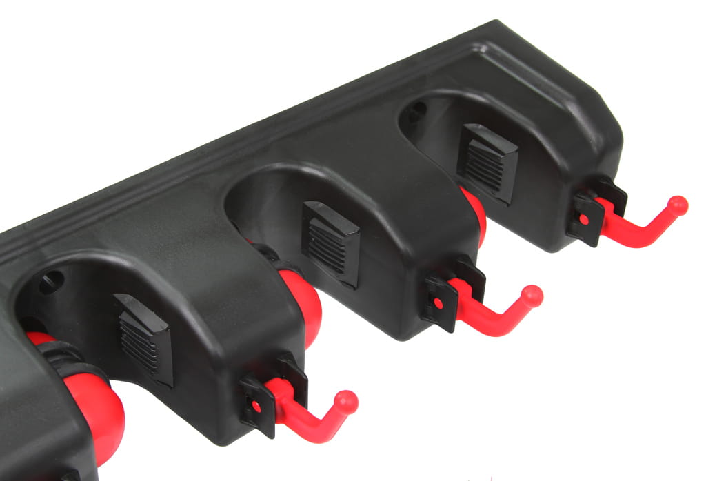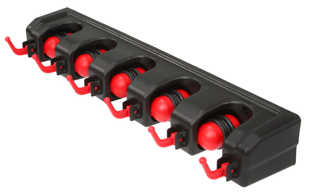 Wieszak wyposażony został w aż 5 automatycznych uchwytów, które same dopasowują się do grubości trzonka narzędzia (do maksymalnie 32 mm), dzięki samozaciskowej kulce oraz gumie ze stoperem. Uchwyt posiada ponadto 6 dodatkowych składanych wieszaków, które umożliwiają zawieszenie drobniejszych narzędzi jak np. grabki. Dodatkowo dociski uchwytów są sprężynowe, co pozwala wygodnie zawieszać i wyciągać narzędzia. Haczyki można złożyć idealnie licując je z powierzchnią wieszaka.