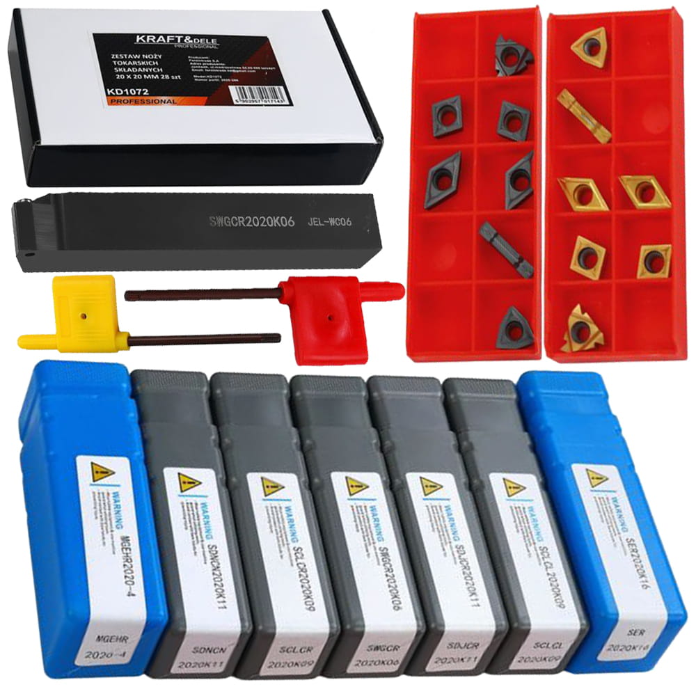 • Kompletny zestaw roboczy – w skład wchodzi 28 elementów, w tym 7 noży tokarskich, 14 ostrzy oraz 7 kluczy montażowych, zapakowanych w poręczne opakowanie.