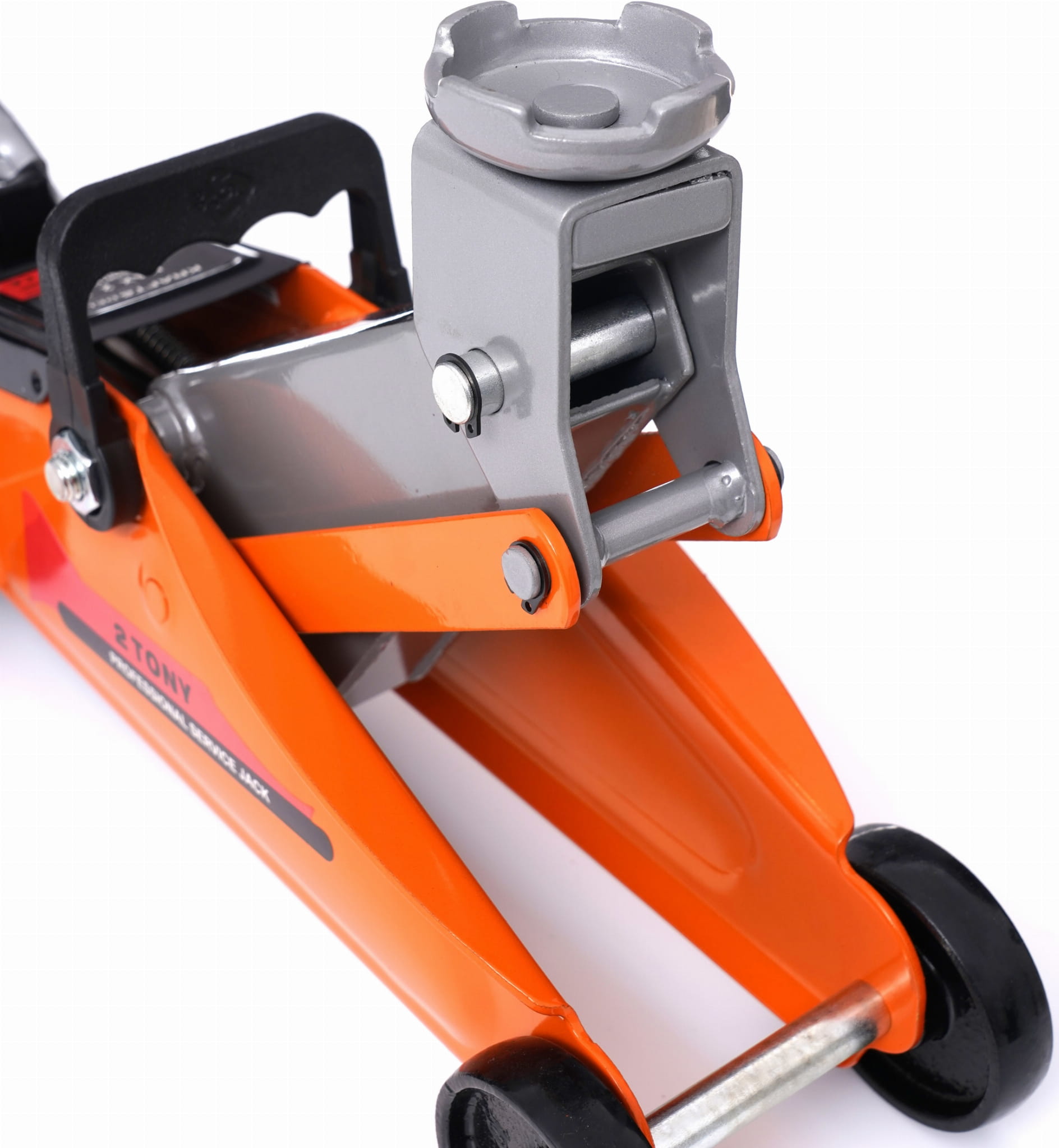 Podnośnik o udźwigu 2 tony wyposażony w stalowe koła osi przedniej oraz łożyskowane koła skrętne osi tylnej