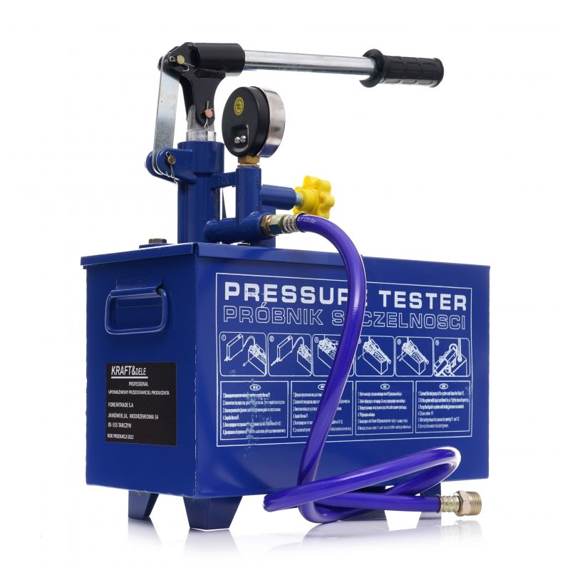 Solidna konstrukcja zbiornika oraz elementów roboczych zapewnia odporność na typowe obciążenia występujące podczas testów instalacji. Czytelny manometr umożliwia szybkie odczytanie wartości ciśnienia, co zwiększa kontrolę nad przebiegiem testu.