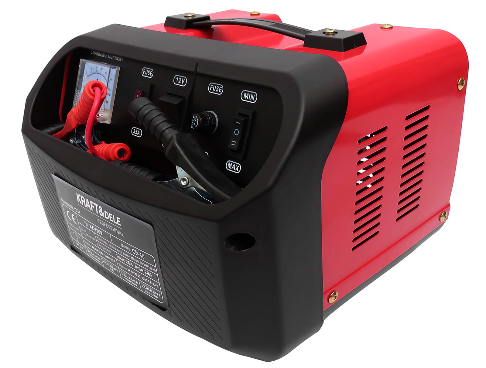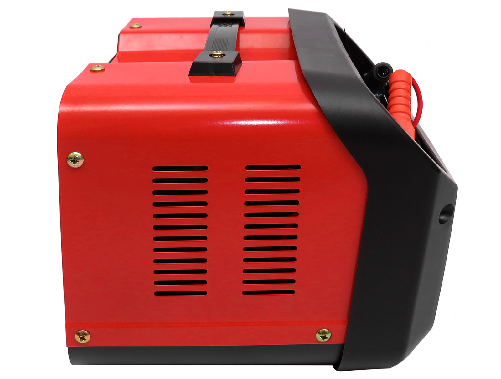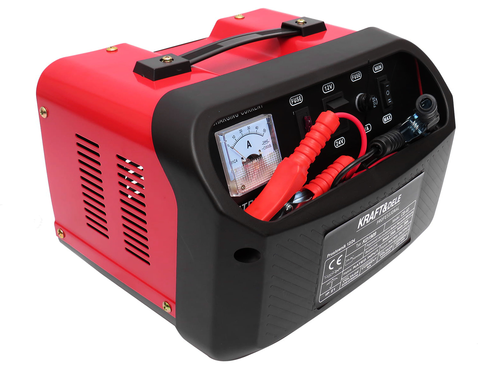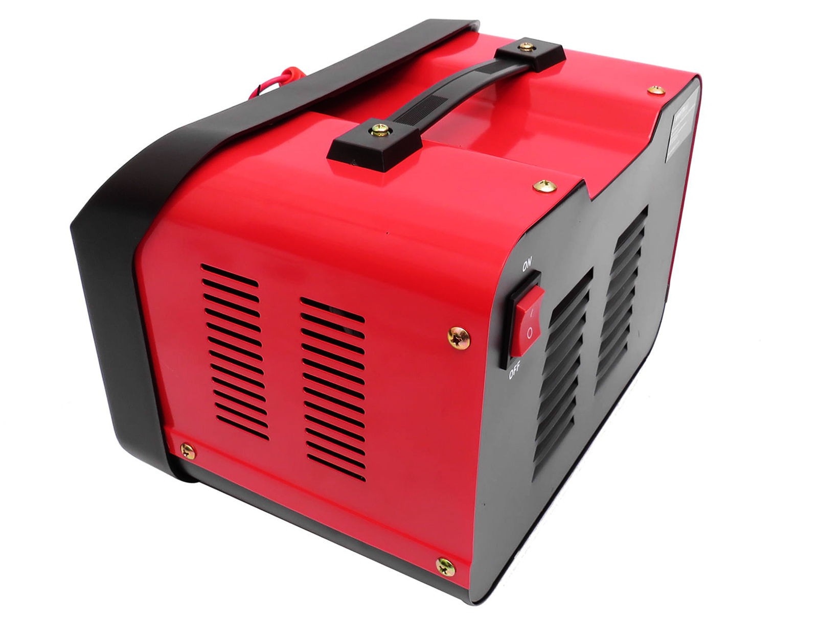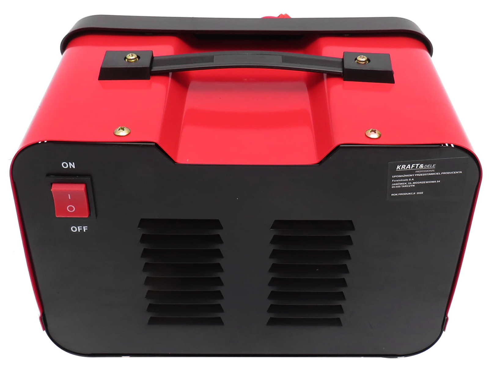 Obudowa urządzenia została zaprojektowana z myślą o trwałości i stabilności pracy. Zastosowane komponenty elektryczne oraz system zabezpieczeń zwiększają odporność na przeciążenia. Wbudowany amperomierz umieszczony w czytelnym miejscu umożliwia stałe monitorowanie parametrów ładowania. Uchwyt transportowy poprawia mobilność urządzenia, co ma znaczenie w pracy warsztatowej, gdzie sprzęt często zmienia miejsce użytkowania.