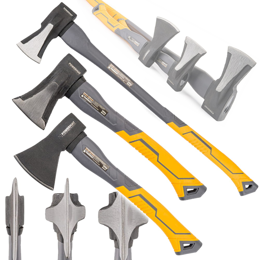 - Zróżnicowane wagi siekier – zestaw obejmuje trzy modele, co pozwala dobrać odpowiednie narzędzie do rodzaju pracy i twardości drewna