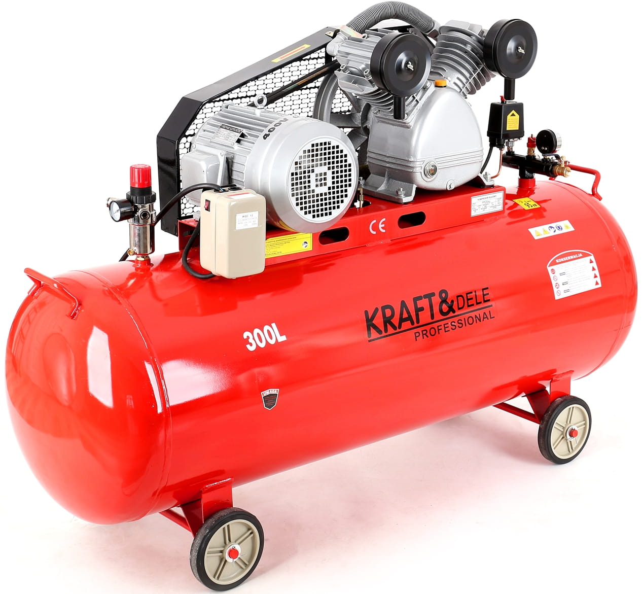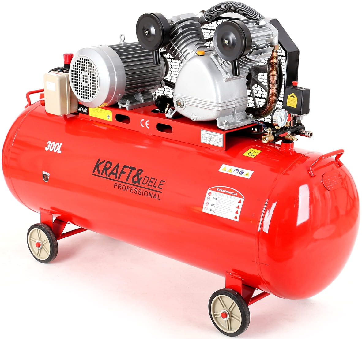 Kompresor Kraft&Dele to żeliwna dwutłokowa sprężarka smarowana olejem osadzona na 300 litrowym zbiorniku. Ogromna wydajność 820 l/min zaspokoi potrzeby warsztatów samochodowych, wulkanizacji, lakierni oraz wszystkie miejsca gdzie wykorzystuje się sprężone powietrze w dużych ilościach.