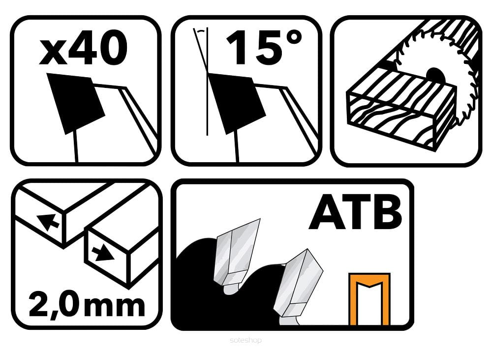 Solidna konstrukcja tarczy oparta została na hartowanym dysku, który charakteryzuje się dużą sztywnością i odpornością na naprężenia podczas pracy. Geometria ATB (Alternate Top Bevel) oraz kąt nachylenia zębów +15° umożliwiają wydajne i precyzyjne skrawanie materiału, zarówno w cięciach wzdłużnych, poprzecznych, jak i skośnych.