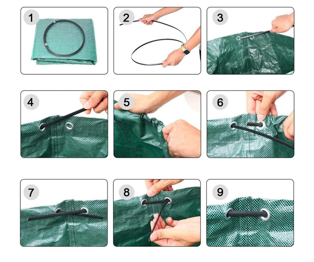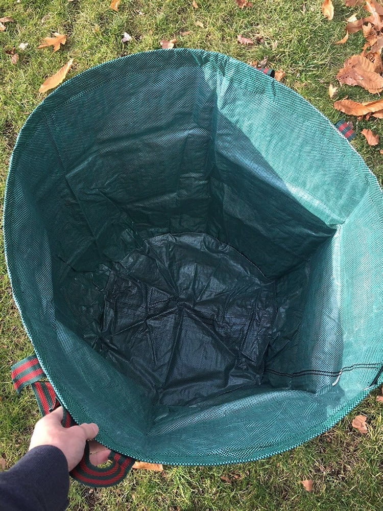 - Sztywna konstrukcja worka umożliwia szybkie wrzucanie do niego zgrabionych liści, igieł, skoszonej trawy i innych odpadów, bez konieczności każdorazowego podnoszenia i rozwijania worka.