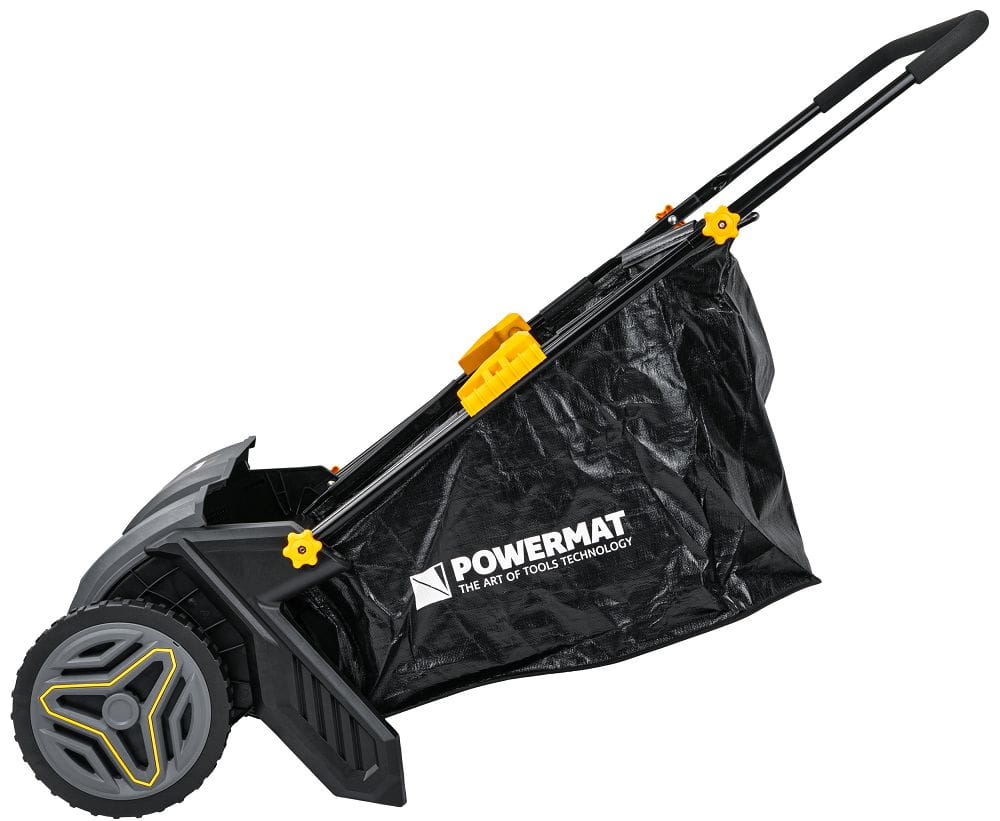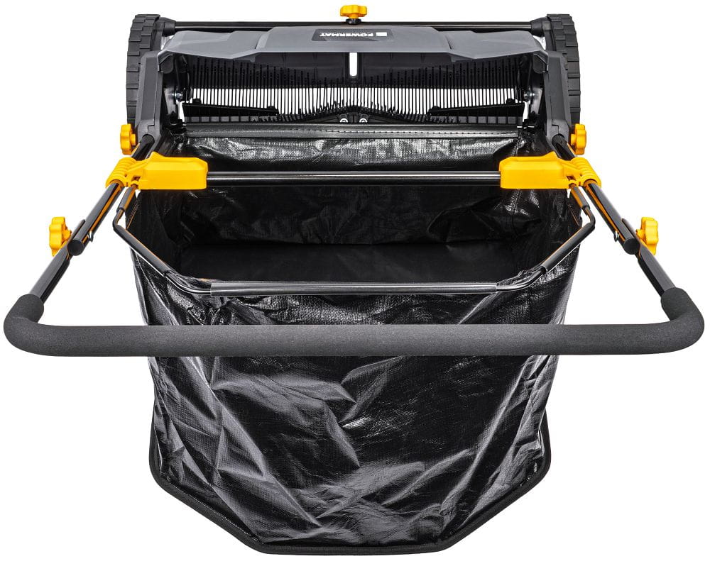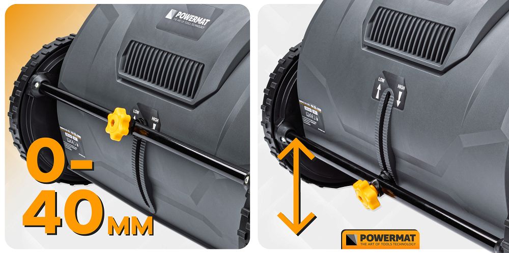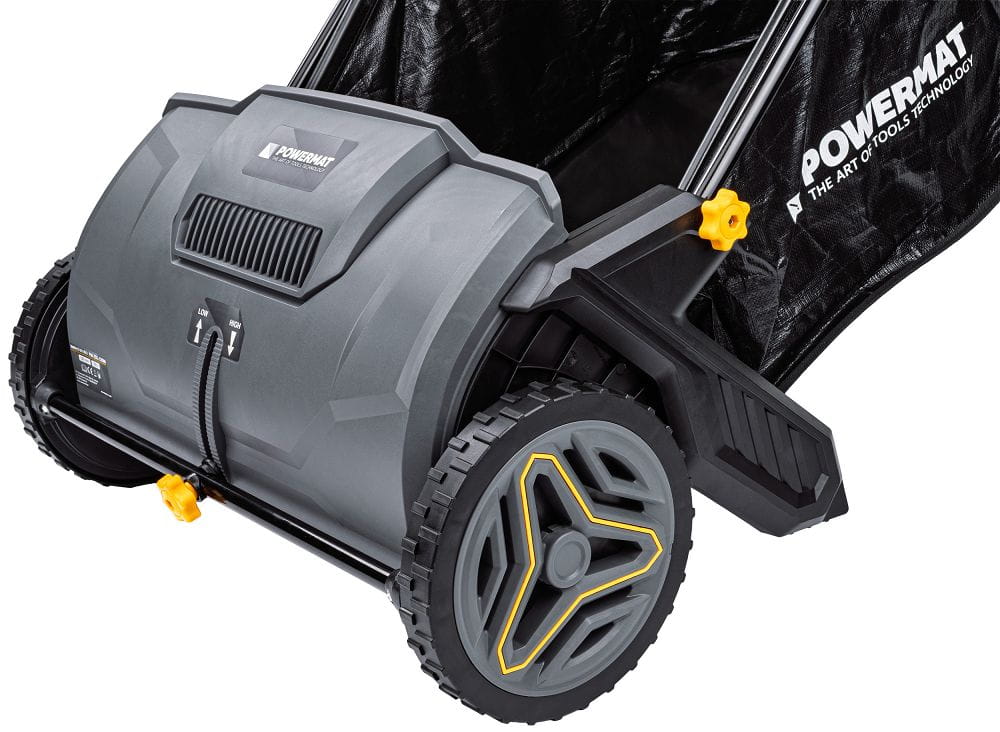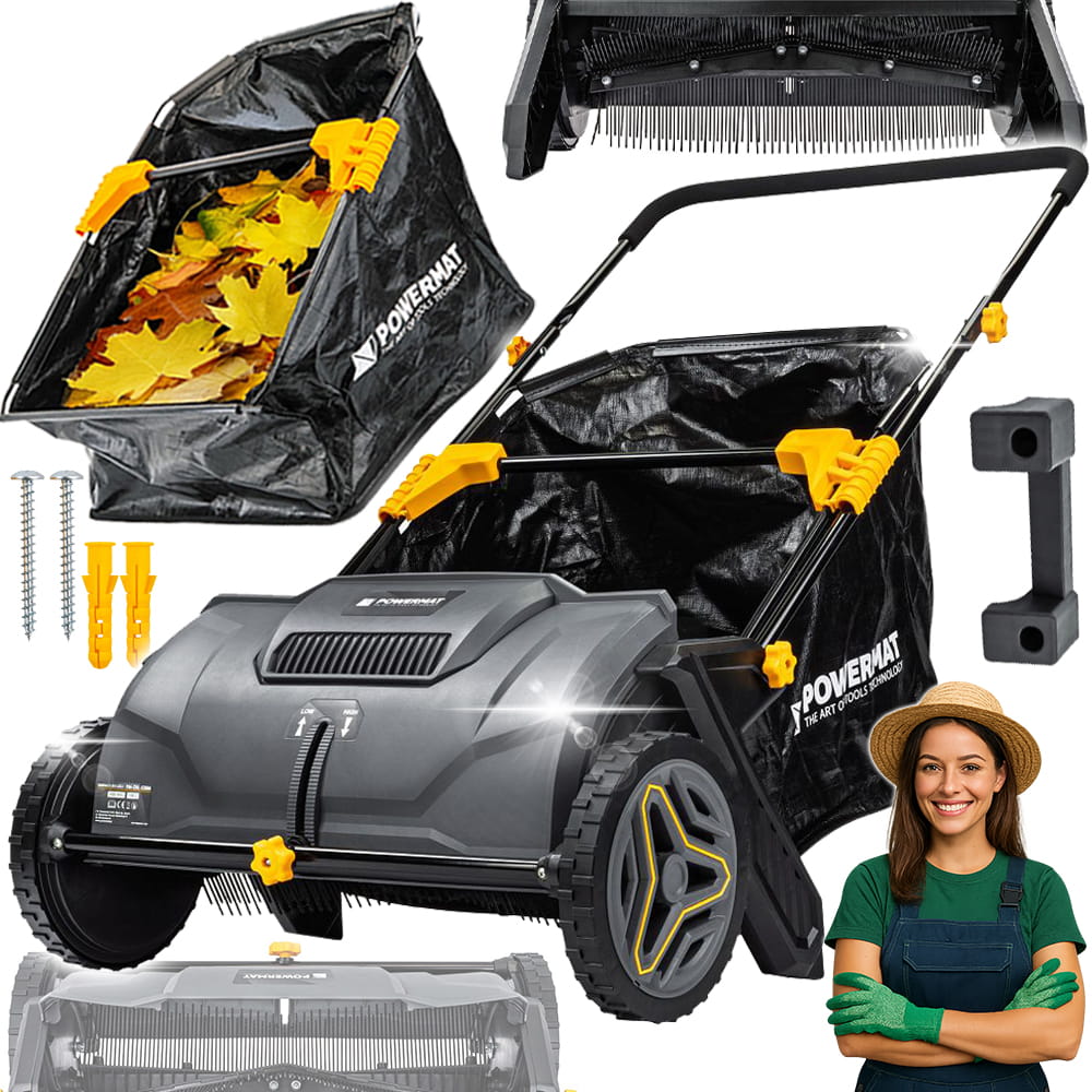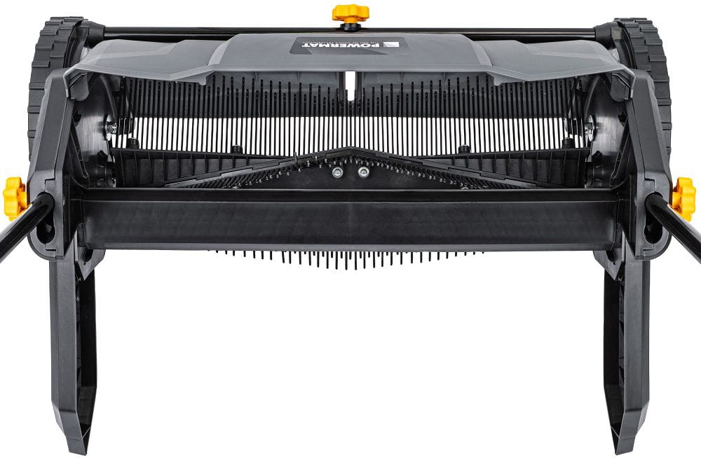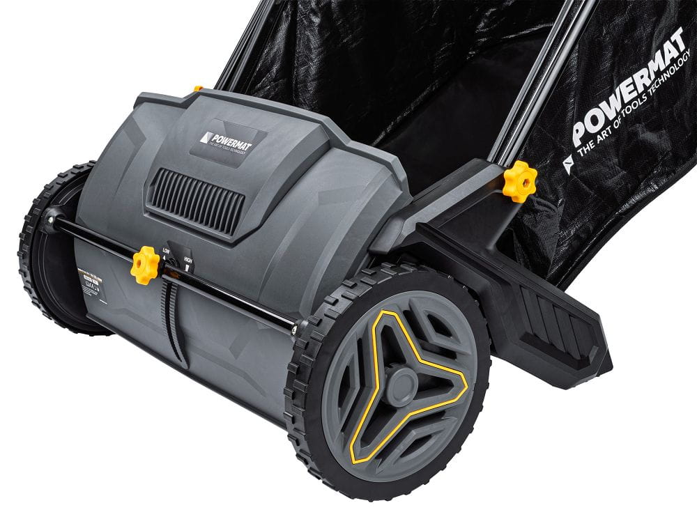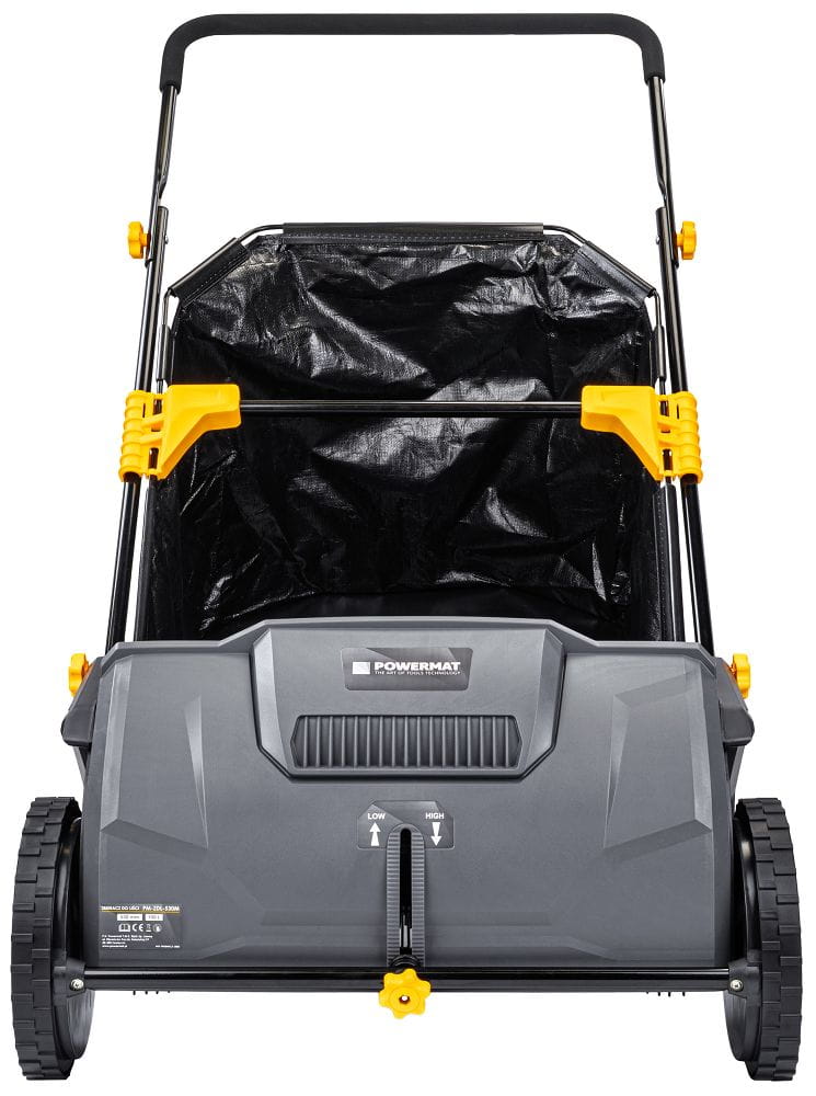 Płynna regulacja wysokości szczotek w zakresie od 0 do 40 mm umożliwia dostosowanie pracy urządzenia do rodzaju podłoża i stopnia zabrudzenia. Pozwala to na skuteczne czyszczenie zarówno równych powierzchni, jak i mniej regularnych fragmentów trawnika, bez ryzyka uszkodzenia murawy. Zbieracz został wyposażony w pojemny kosz o pojemności 100 litrów, wykonany z wytrzymałego materiału odpornego na obciążenia. Umożliwia on długą pracę bez konieczności częstego opróżniania, a prosty system mocowania pozwala na szybkie wypięcie i ponowne zamontowanie pojemnika.
