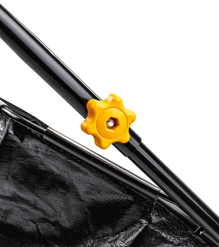 Solidny, metalowy uchwyt z piankową powłoką poliuretanową zapewnia stabilny chwyt oraz komfortową obsługę nawet przy dłuższym użytkowaniu. Składana rączka z blokadą pozwala łatwo przygotować urządzenie do transportu lub przechowywania, bez potrzeby użycia narzędzi. Dzięki lekkiej konstrukcji o wadze zaledwie 6,3 kg, zbieracz jest wyjątkowo łatwy w manewrowaniu, a możliwość zawieszenia go na ścianie przy pomocy dołączonego uchwytu pozwala oszczędzić cenne miejsce w garażu lub schowku.