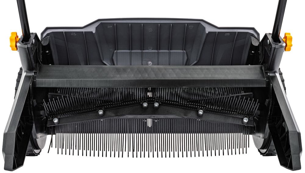 Urządzenie wyposażono w szerokość roboczą wynoszącą 53 cm, co pozwala na szybkie i skuteczne oczyszczanie dużych powierzchni bez konieczności częstego powtarzania przejść. Obrotowe szczotki, napędzane ruchem kół, wciągają liście, trawę, piasek i drobne gałązki bez użycia silnika. Duże, 250-milimetrowe koła gwarantują stabilne prowadzenie na zróżnicowanym terenie – od trawnika po bruk czy żwir – a ich konstrukcja ułatwia pokonywanie nierówności. Dzięki temu praca przebiega płynnie i bez wysiłku.