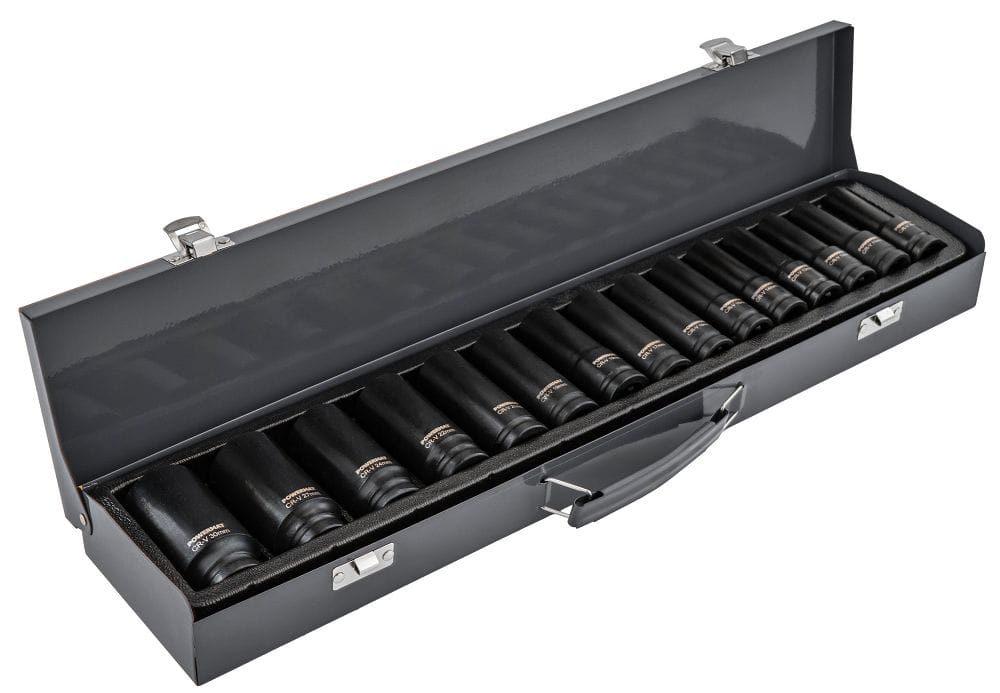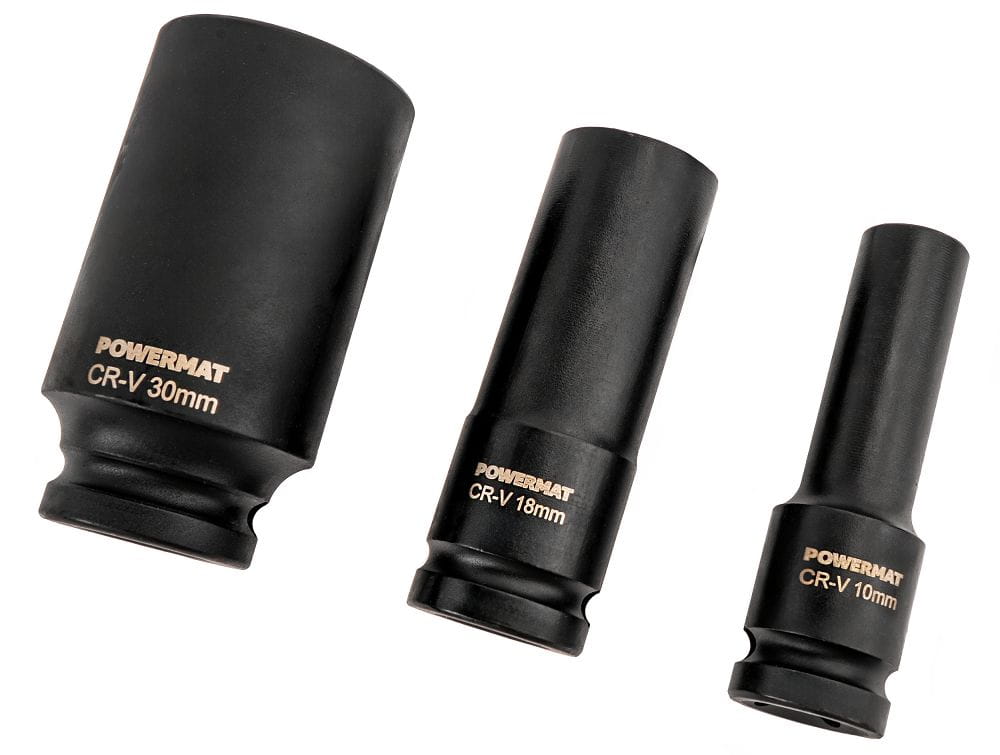 - WYSOKA JAKOŚĆ WYKONANIA – nasadki wykonano ze stali chromowo-wanadowej Cr-V, przystosowanej do pracy udarowej i dużych obciążeń.