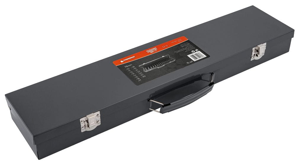 Zestaw umieszczono w metalowej walizce transportowej, która zabezpiecza nasadki podczas przechowywania i transportu. Każdy element ma wyznaczone miejsce, co ułatwia organizację pracy i szybki dostęp do właściwego rozmiaru.