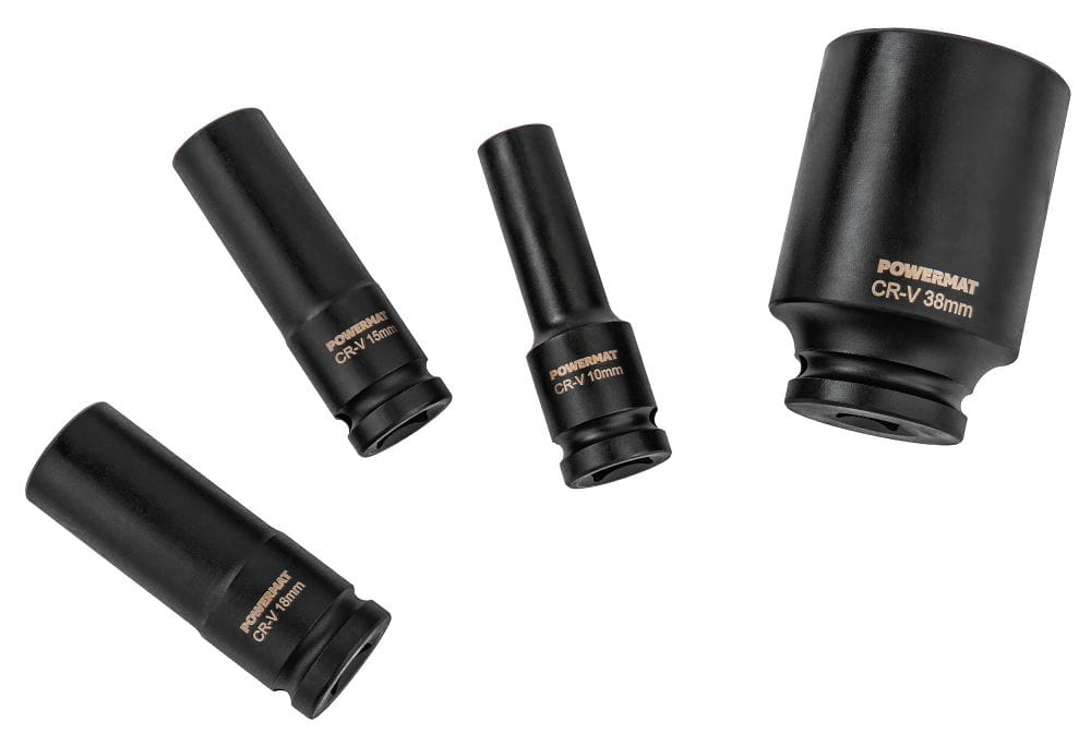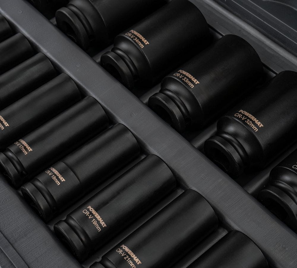 - WYSOKA JAKOŚĆ WYKONANIA – nasadki wykonano ze stali chromowo-wanadowej Cr-V, przystosowanej do przenoszenia obciążeń udarowych i intensywnej eksploatacji.
