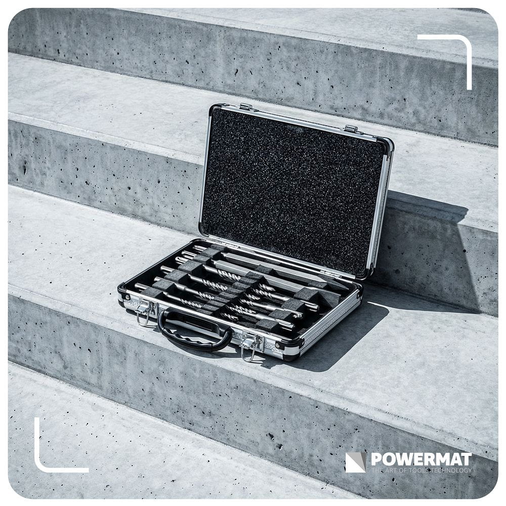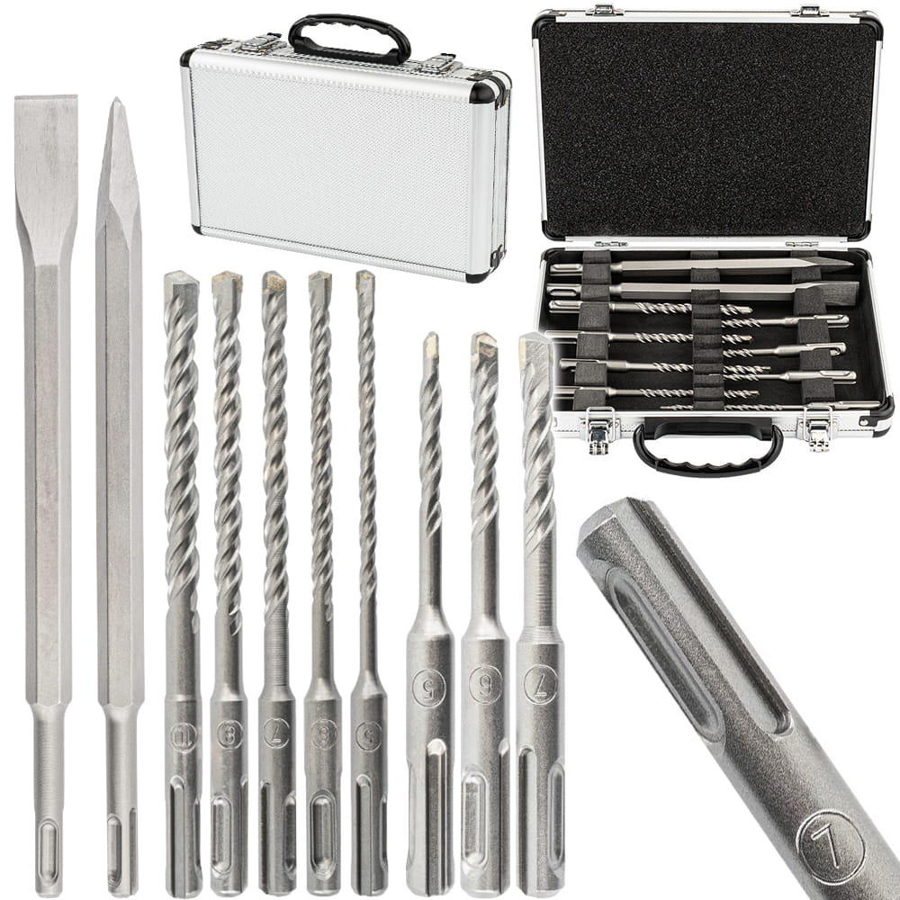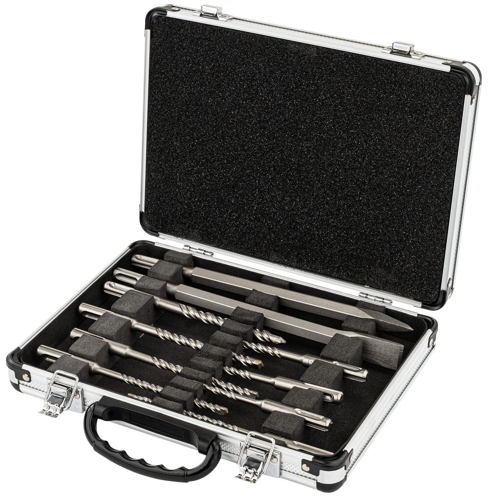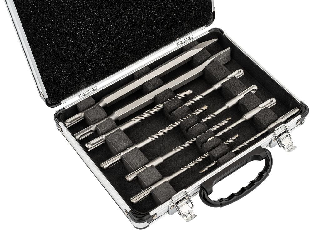 Zestaw osprzętu SDS Plus przeznaczony jest do wiercenia oraz kucia w twardych materiałach budowlanych. Komplet obejmuje wiertła o najczęściej stosowanych średnicach oraz dwa typy dłut, co umożliwia wykonywanie zarówno otworów montażowych, jak i prac wyburzeniowych czy bruzdowania.